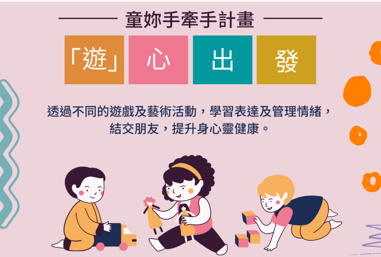 透過遊戲和藝術的形式令小朋友學習及管理内心的情緒,結識朋友,提升身、心、靈健康。