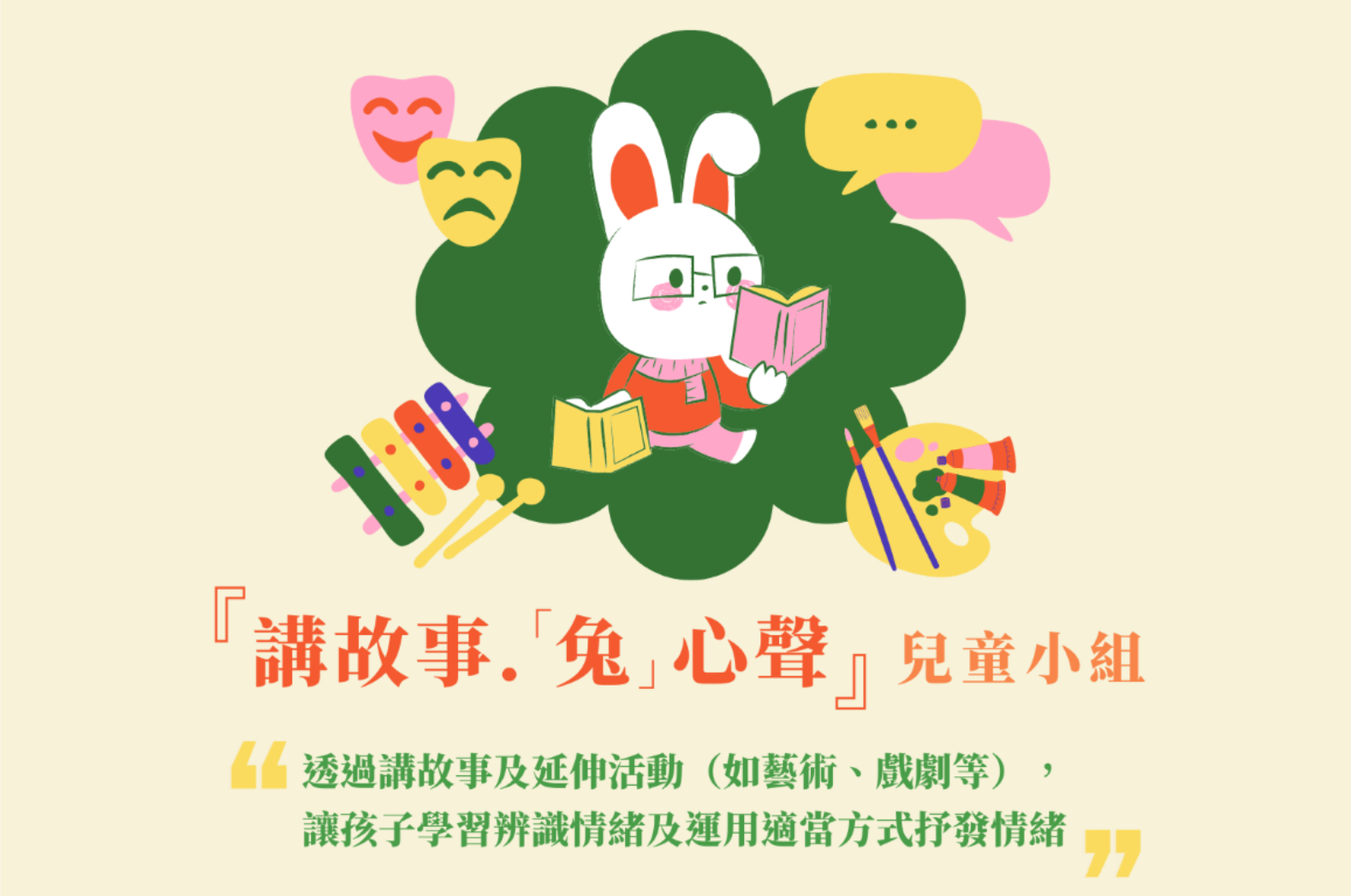 透過講故事及延伸活動(如藝術、戲劇等),讓孩子學習辨識情緒及運用適當方式抒發情緒。