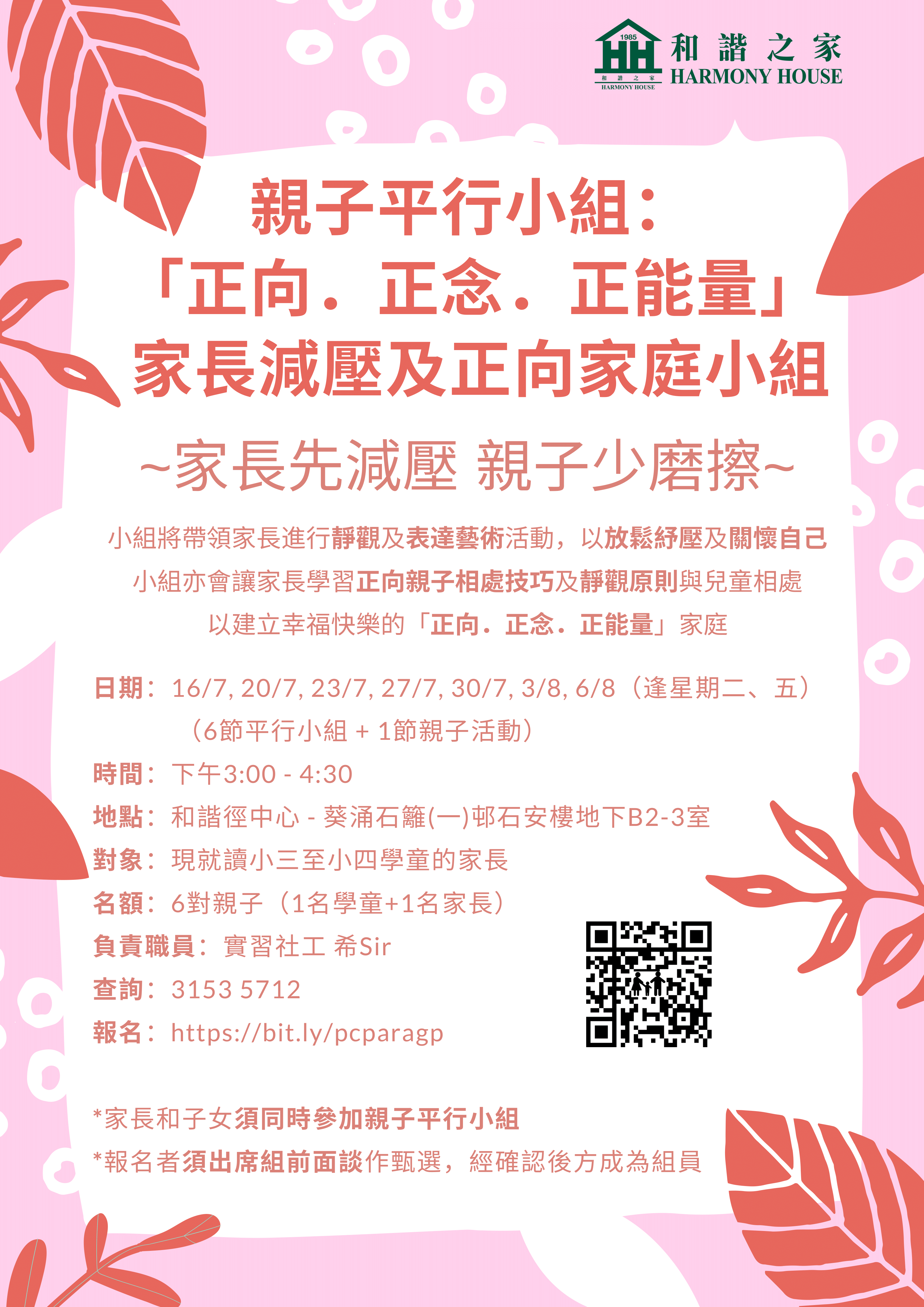 小組亦會讓家長學習正向親子相處技巧及靜觀原則與兒童相處,以建立幸福快樂的「正向.正念.正能量」家庭