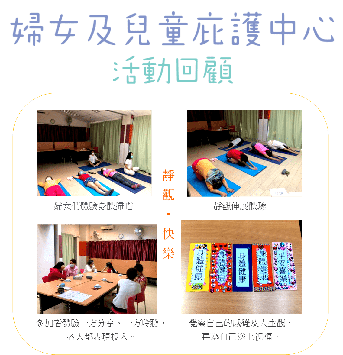 小組將帶領家長進行靜觀及表達藝術活動,以放鬆紓壓及關懷自己。